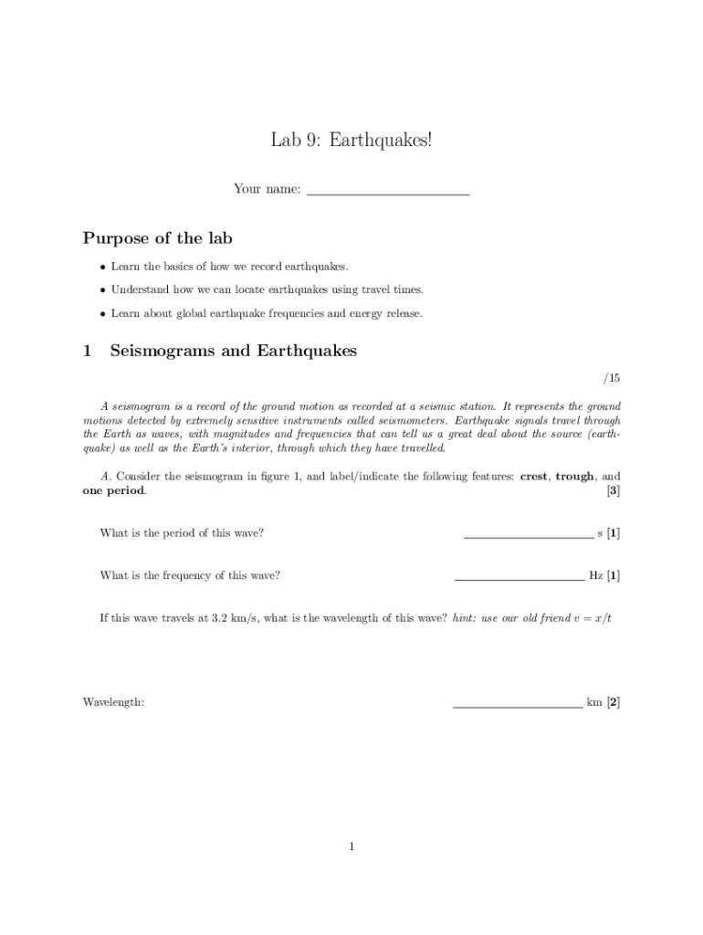 Lab 9: Earthquakes! Your name:Purpose of the lab Learn the basics of how we record earthquakes. Understand how we can locate earthquakes using travel times. Learn about global earthquake frequencies