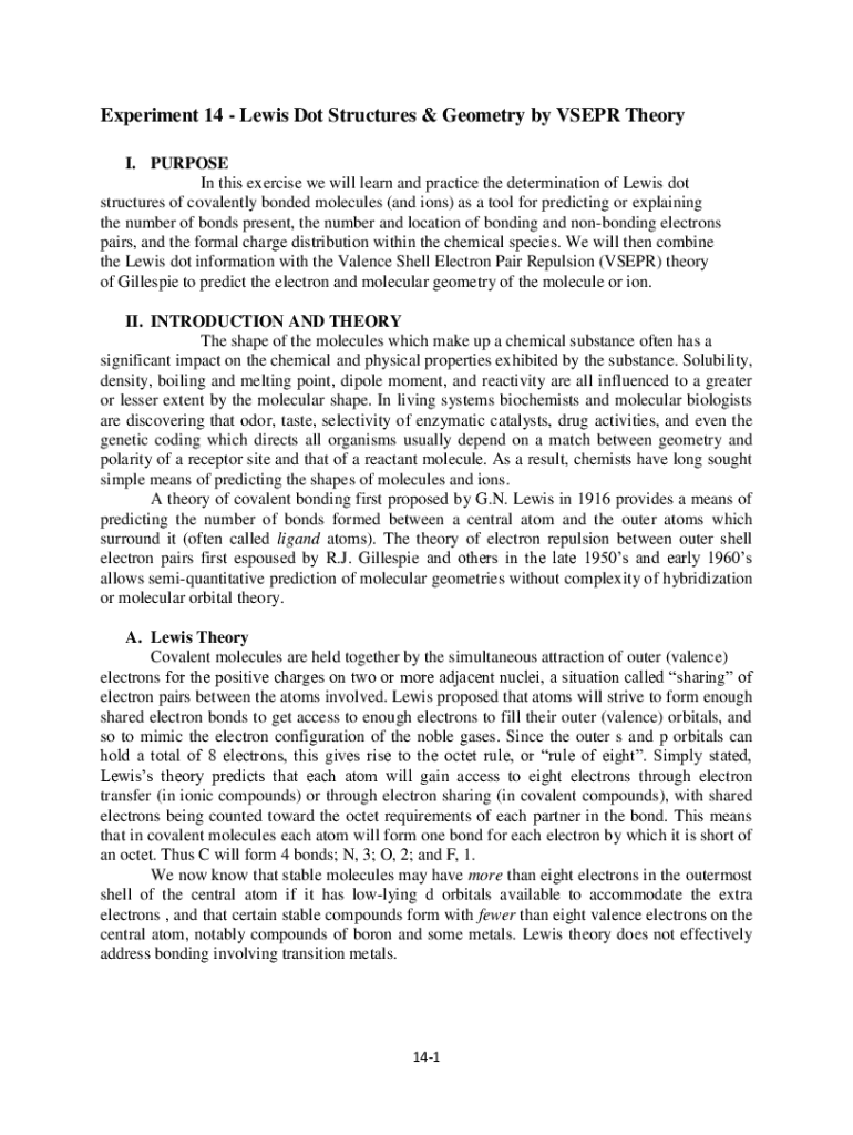 Experiment 14 - Lewis is designed for individuals who are studying chemistry or interested in conducting experiments related to Lewis structures, electron dot diagrams, and chemical bonding.