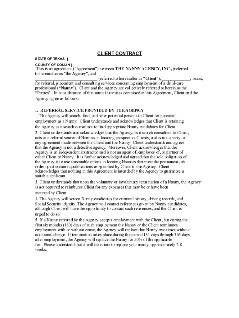 CLIENT CONTRACT STATE OF TEXAS COUNTY OF COLLIN This is an agreement (Agreement) between THE NANNY AGENCY, INC., (referred to hereinafter as the Agency, and ___ (referred to hereinafter as Client),