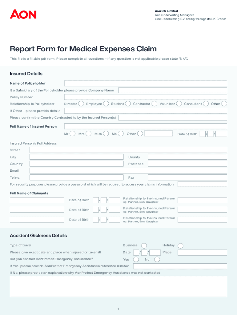 Aon UK Limited Underwriting Managers One Underwriting B.V. acting through its UK BranchReport Form for Medical Expenses Claim This file is a fillable PDF form. Please complete all questions if any
