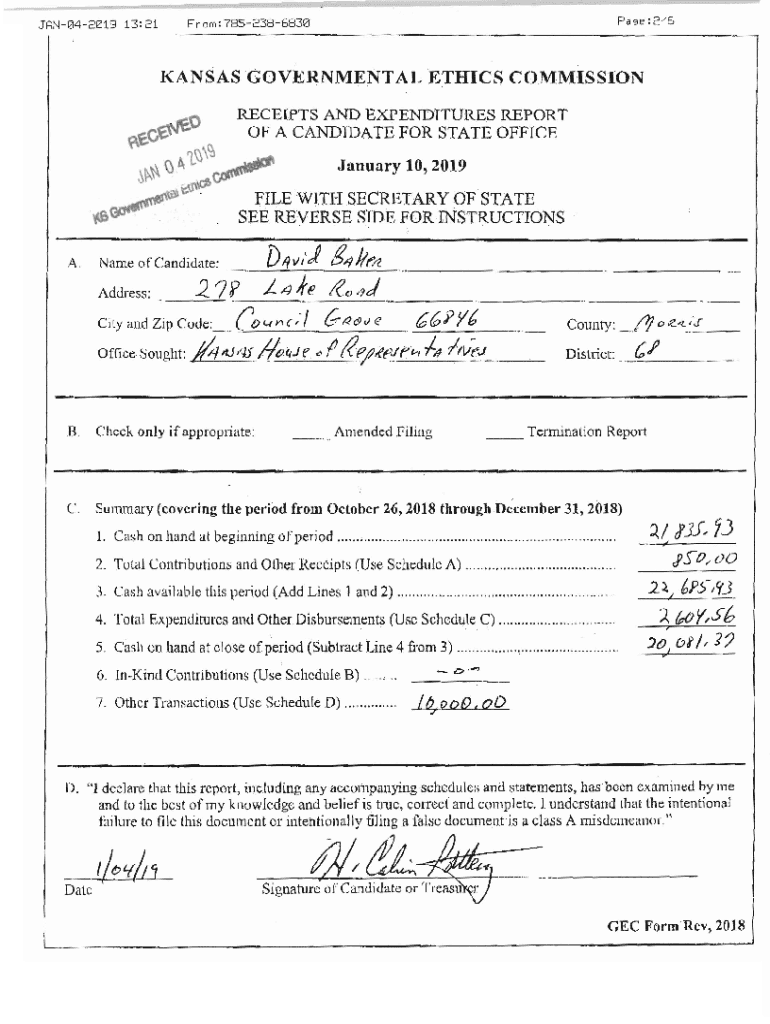From: 7852386830JAN042019 13:21KANSAS GOVERNMENTAL ETIIICS COMMISSION RECEIPTS AND EXPENDITURES REPORTrc..OO A CANDIDATE FOR STATE OFFICE_At 1()j . \"d\'r;P\'.,yo.A...Junuary 10,2019FILEWITB:SECRETARY