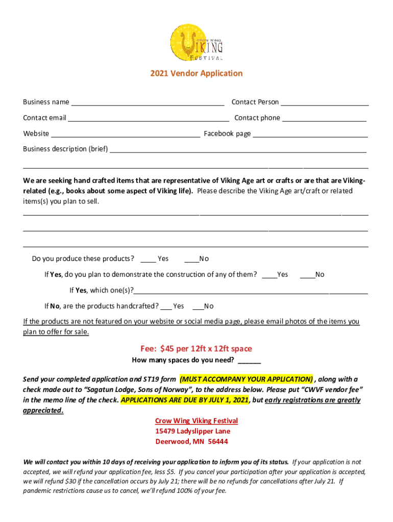Get the free 2021 Vendor Application Fee: $45 per 12ft x 12ft space
