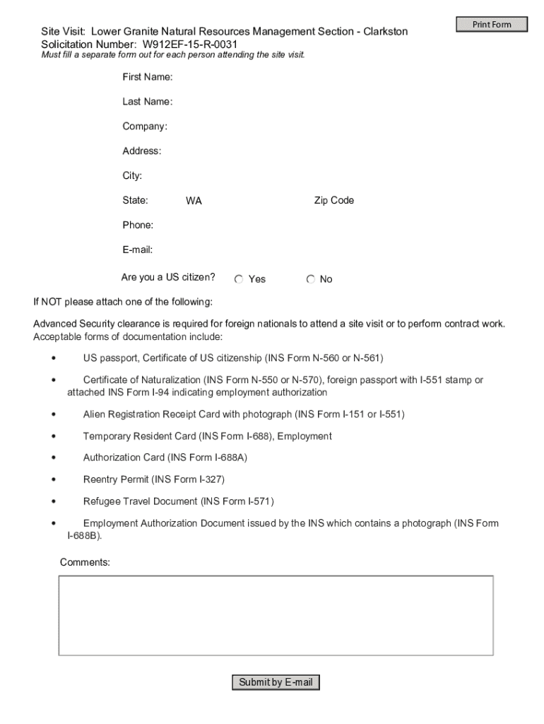 Site Visit: Lower Granite Natural Resources Management Section Clarkston Solicitation Number: W912EF15R0031Print FormMust fill a separate form out for each person attending the site visit.First Name:
