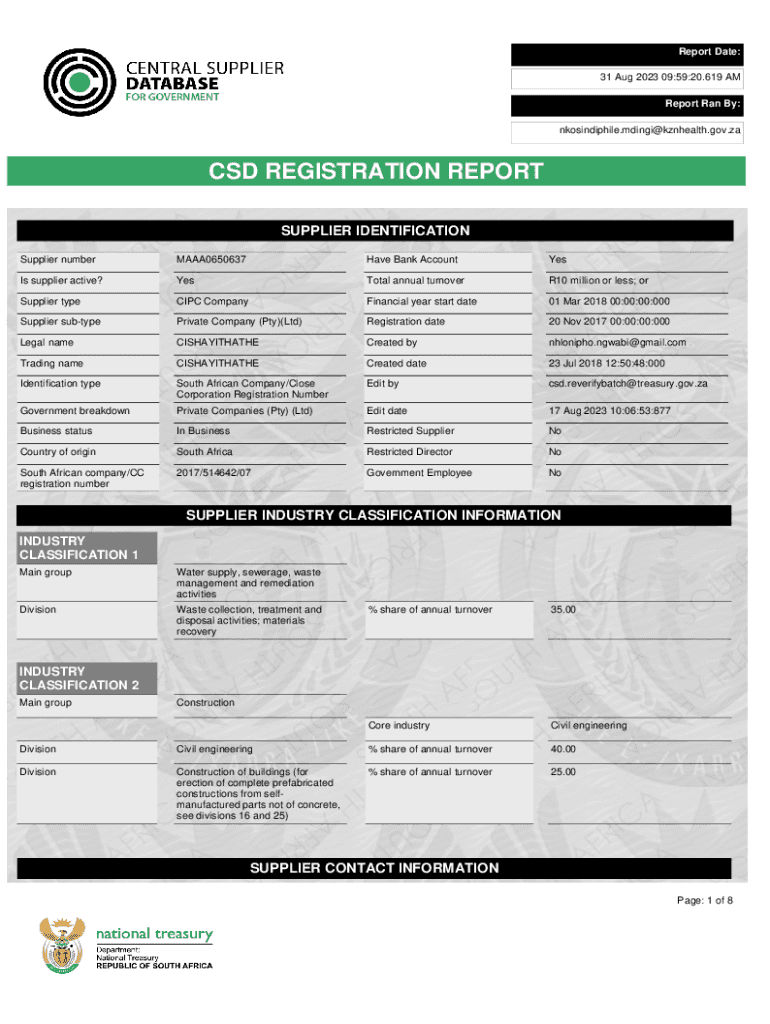 Report Date: 31 Aug 2023 09:59:20.619 AM Report Ran By: nkosindiphile.mdingi@kznhealth.gov.zaCSD REGISTRATION REPORT SUPPLIER IDENTIFICATION Supplier numberMAAA0650637Have Bank AccountYesIs supplier