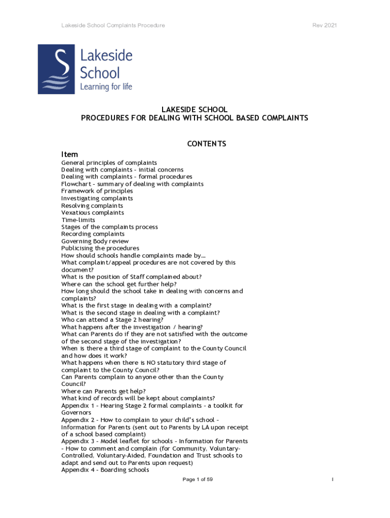 Lakeside School Complaints ProcedureRev 2021LAKESIDE SCHOOL PROCEDURES FOR DEALING WITH SCHOOL BASED COMPLAINTS CONTENTS Item General principles of complaints Dealing with complaints initial concerns
