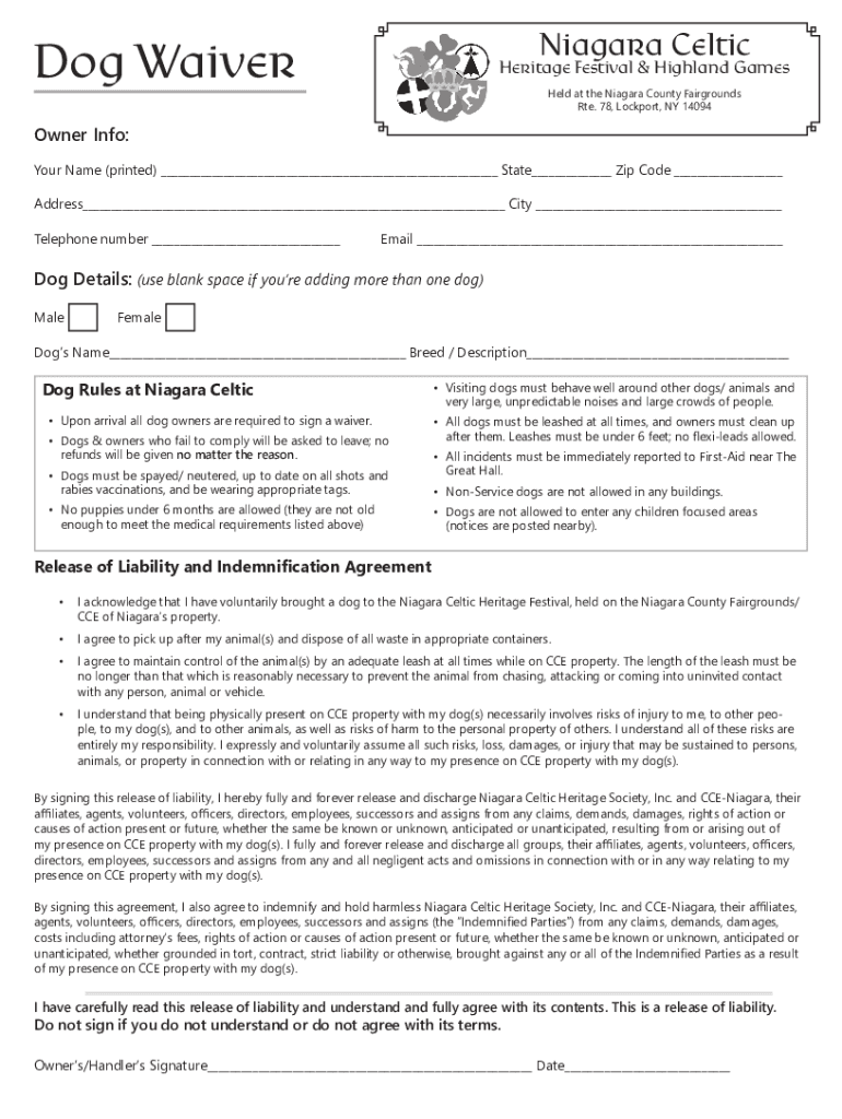 Niagara CelticDog WaiverHeritage Festival & Highland Games Held at the Niagara County Fairgrounds Rte. 78, Lockport, NY 14094Owner Info: Your Name (printed) ___ State___ Zip Code ___ Address___ City