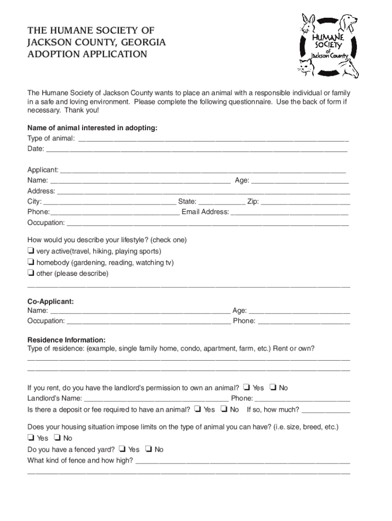 ADOPTION Application Humane Society of Jackson County wants to place an animal with a responsible individual or family