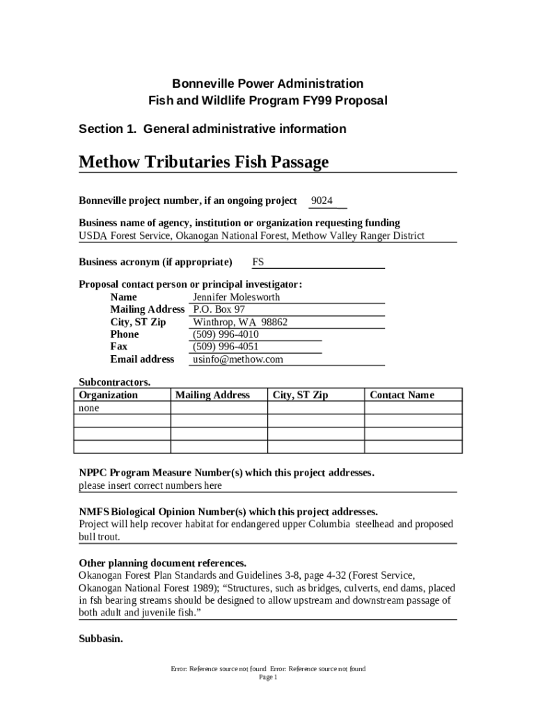 The Bonneville Power Administration Fish and Wildlife ... - cfw nwcouncil is a Word document you can get completed and signed for specific purpose. Next, it is furnished to the actual addressee to provide specific information of any kinds. The completion and signing may be done in hard copy or via an appropriate application e. g. PDFfiller. These tools help to send in any PDF or Word file without printing out. It also lets you customize its appearance according to your requirements and put a valid e-signature. Once you're good, you send the Bonneville Power Administration Fish and Wildlife ... - cfw nwcouncil to the respective recipient or several recipients by mail and also fax. PDFfiller has got a feature and options that make your Word form printable. It includes a number of options for printing out. No matter, how you will send a document - in hard copy or electronically - it will always look well-designed and organized. To not to create a new file from scratch again and again, make the original document as a template. After that, you will have a customizable sample.