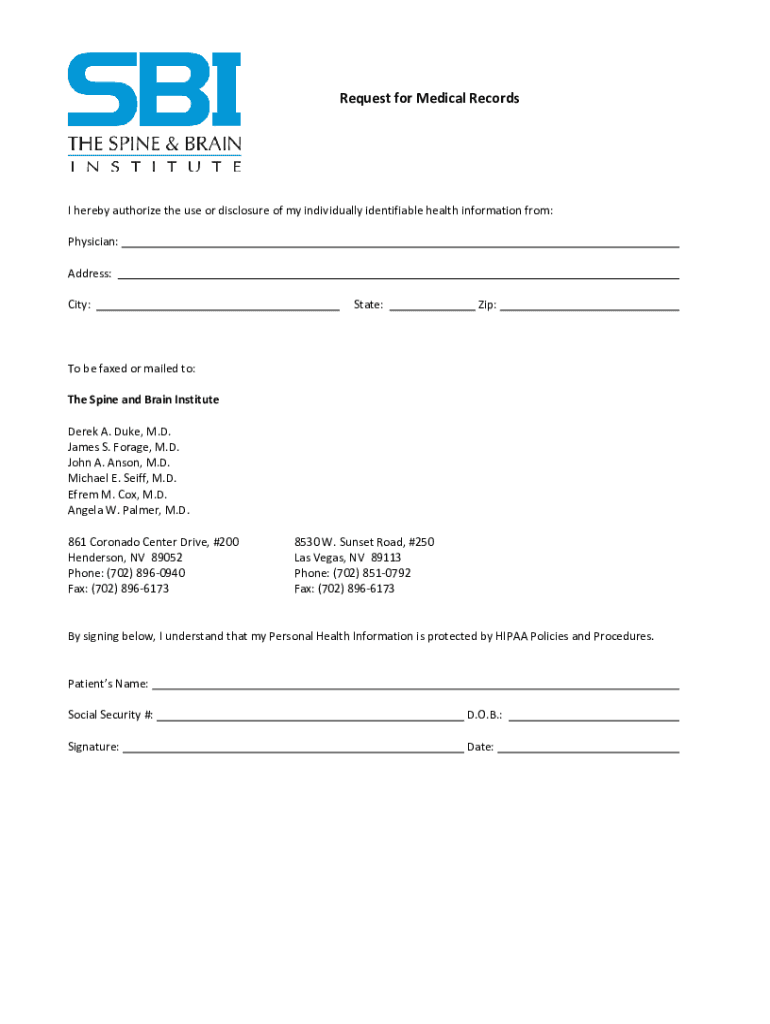 Request for Medical RecordsI hereby authorize the use or disclosure of my individually identifiable health information from: Physician: Address: City:State:Zip:To be faxed or mailed to: The Spine