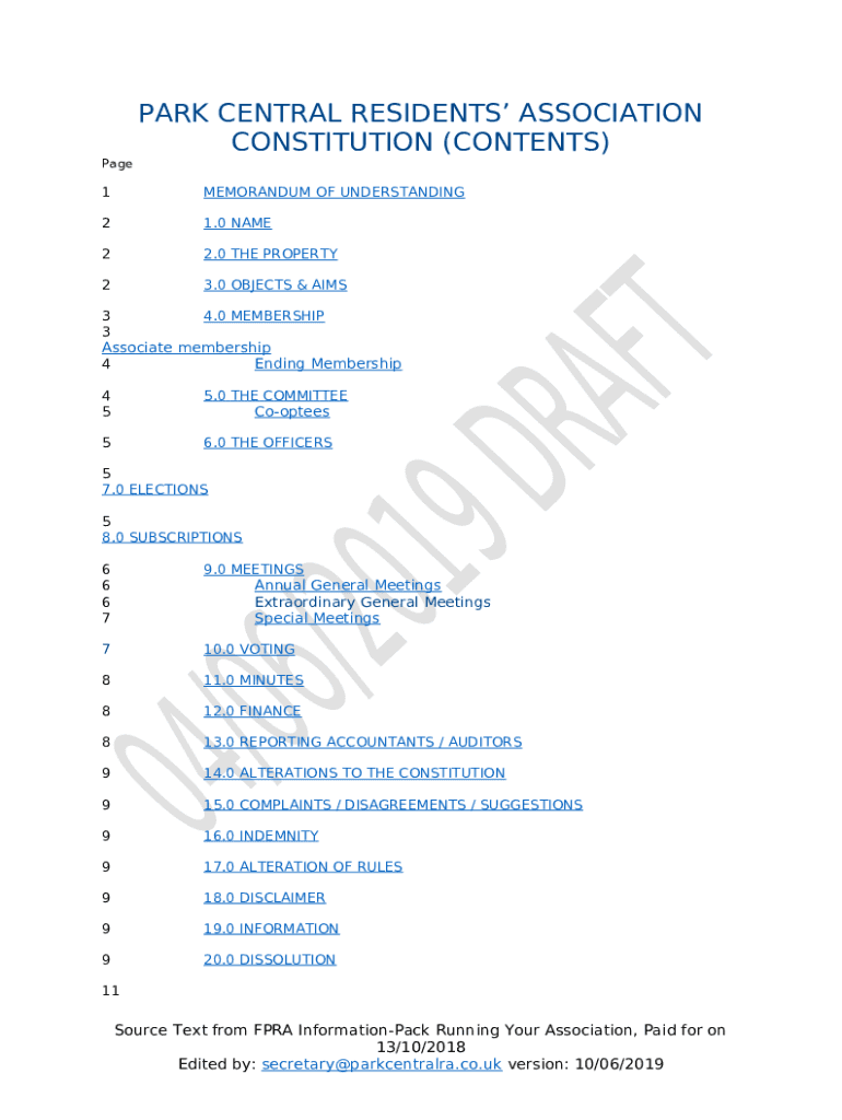 Instructions for the form PARK CENTRAL RESIDENTS' ASSOCIATION CONSTITUTION (CONTENTS)