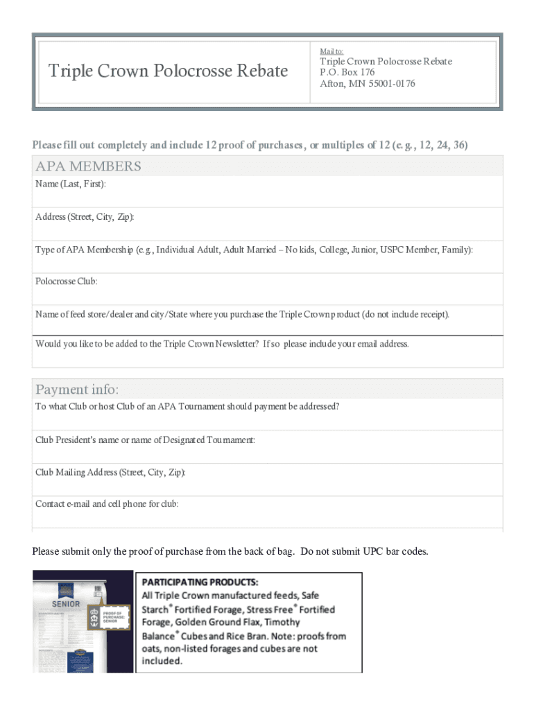 Mail to:Triple Crown Polocrosse RebateTriple Crown Polocrosse Rebate P.O. Box 176 Afton, MN 550010176Please fill out completely and include 12 proof of purchases, or multiples of 12 (e.g., 12, 24,