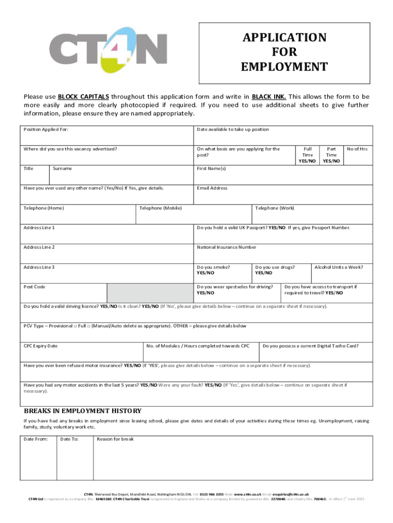 APPLICATION FOR EMPLOYMENT Please use BLOCK CAPITALS throughout this application form and write in BLACK INK. This allows the form to be more easily and more clearly photocopied if required. If you