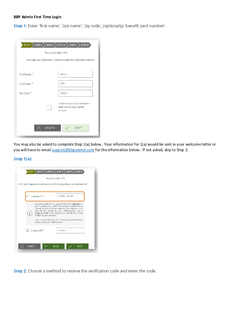 BBP Admin First Time Login Step 1: Enter \'first name\', \'last name\', \'zip code\', (optionally) \'benefit card number\'.You may also be asked to complete Step 1(a) below. Your information for 1(a)