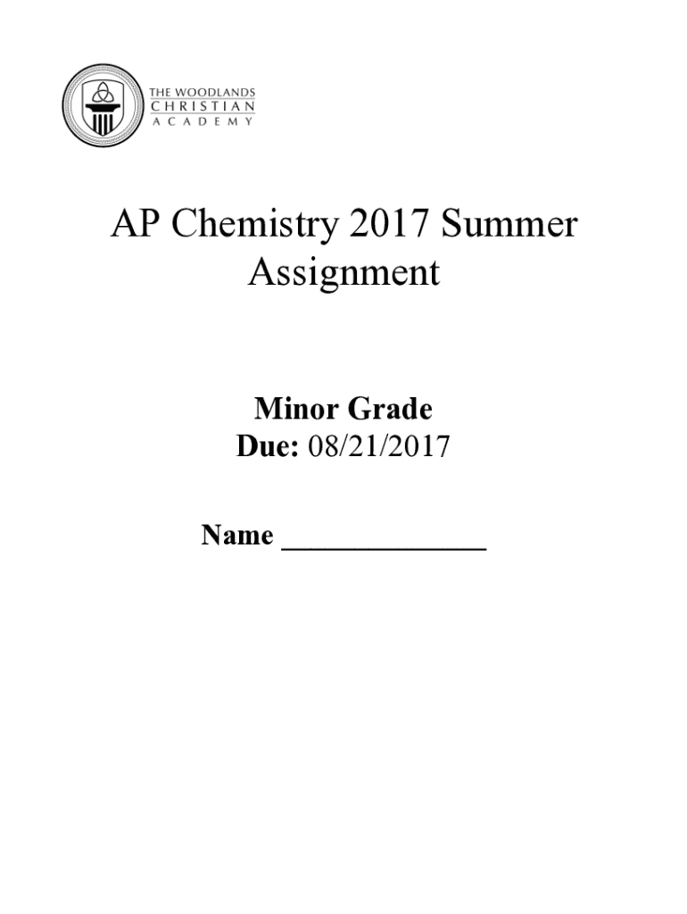 AP Chemistry 2017 Summer Assignment Minor Grade Due: 08/21/2017 Name ___Note: For all questions, assume that the temperature is 298 K, the pressure is 1.00 atmospheres and solutions are aqueous unless