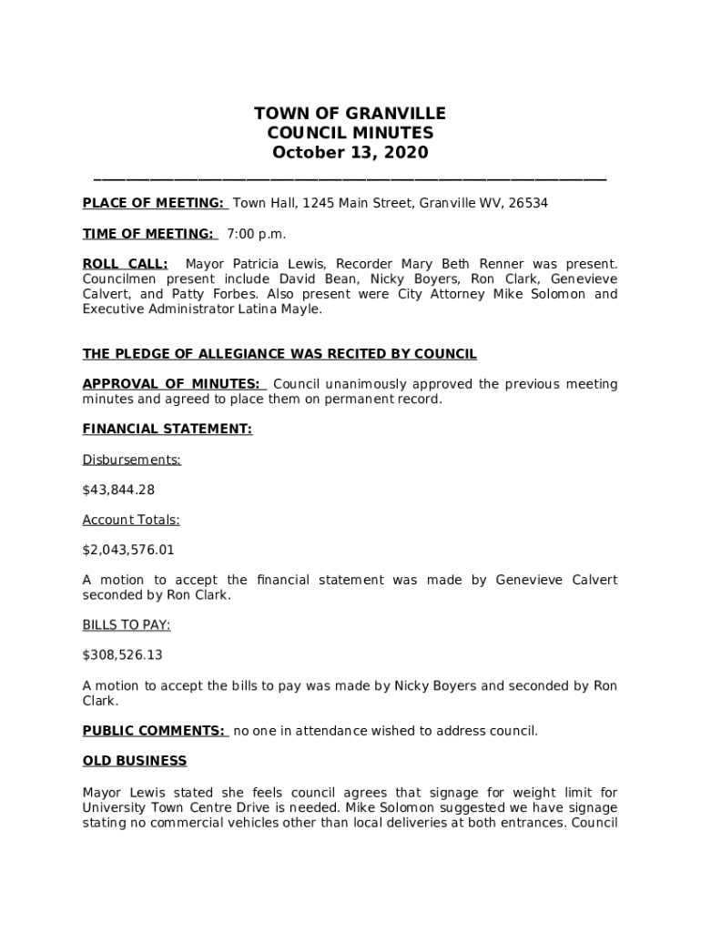The ROLL CALL:Mayor Patricia Lewis, Recorder Mary Beth Renner was present is a writable document which can be filled-out and signed for specified needs. Next, it is furnished to the relevant addressee in order to provide certain details and data. The completion and signing is able manually in hard copy or with a trusted application like PDFfiller. These tools help to fill out any PDF or Word file without printing out. While doing that, you can edit its appearance according to your requirements and put a legal electronic signature. Once you're good, you send the ROLL CALL:Mayor Patricia Lewis, Recorder Mary Beth Renner was present to the respective recipient or several recipients by email or fax. PDFfiller has got a feature and options that make your Word form printable. It has various options when printing out appearance. It does no matter how you distribute a document - in hard copy or electronically - it will always look professional and organized. To not to create a new file from scratch again and again, turn the original form as a template. After that, you will have a rewritable sample.