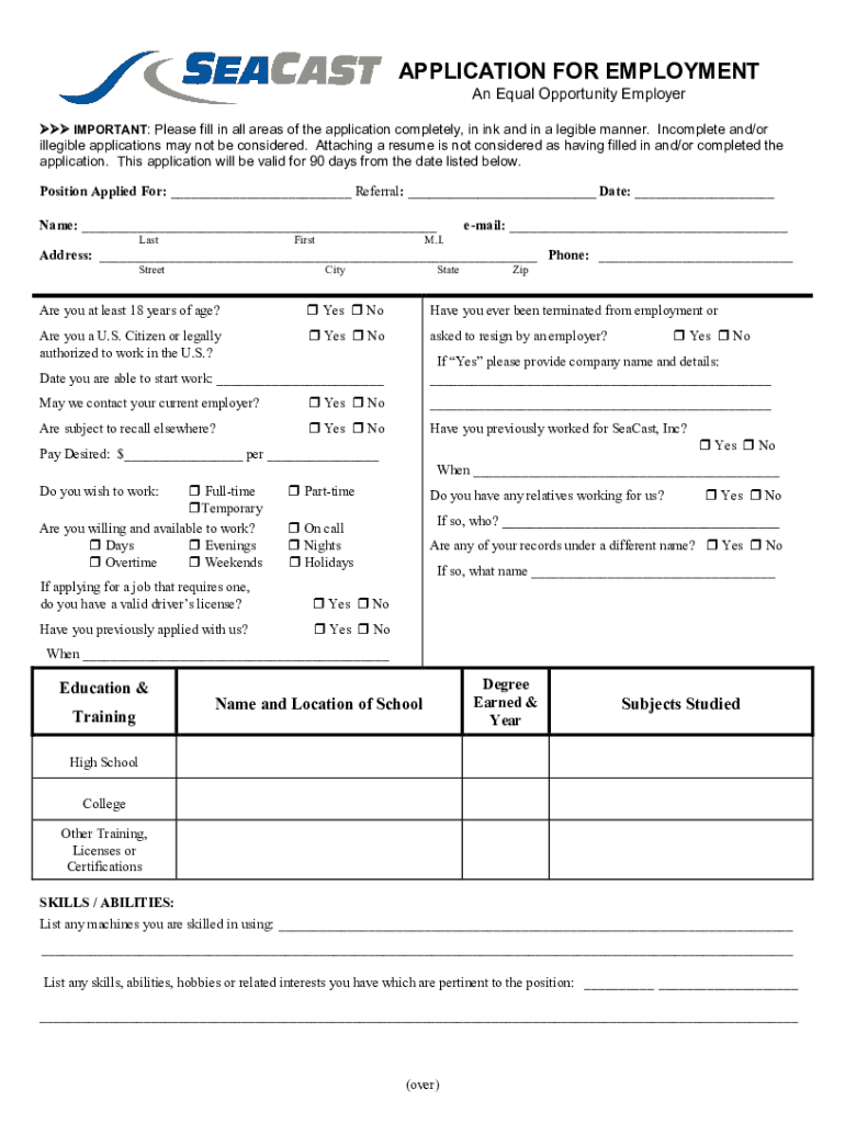 An Equal Opportunity Employer IMPORTANT: Please fill in all areas of the application completely, in ink and in a legible manner. Incomplete and/or