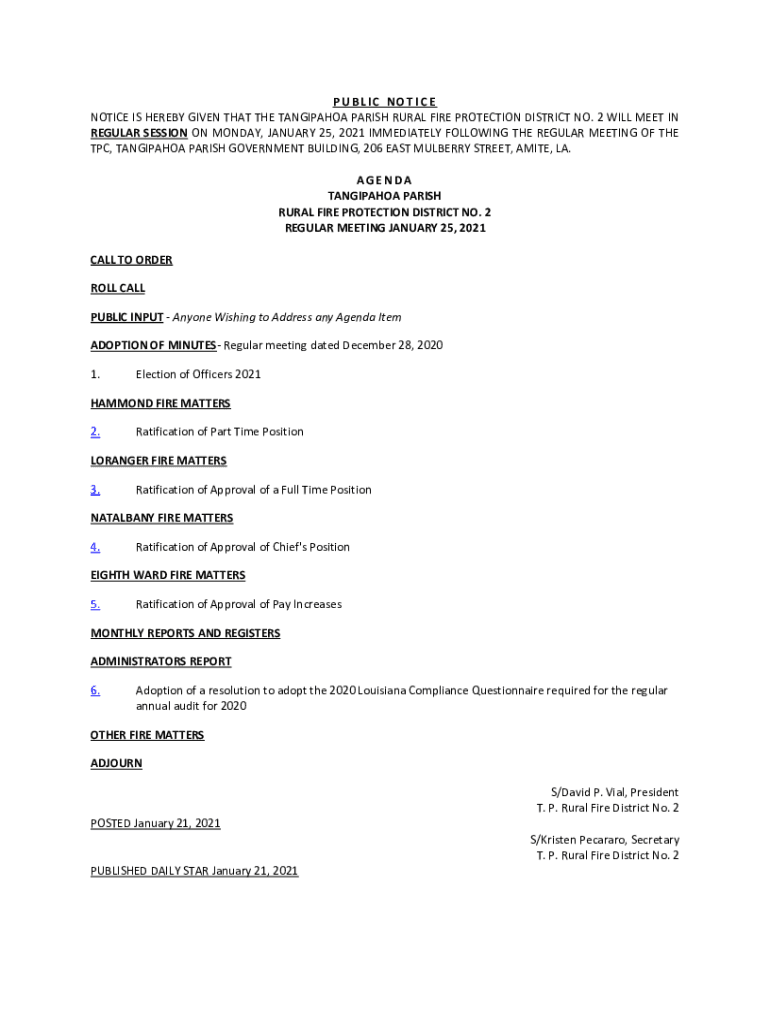 PUBLIC NOTICE NOTICE IS HEREBY GIVEN THAT THE TANGIPAHOA PARISH RURAL FIRE PROTECTION DISTRICT NO. 2 WILL MEET IN REGULAR SESSION ON MONDAY, JANUARY 25, 2021 IMMEDIATELY FOLLOWING THE REGULAR MEETING