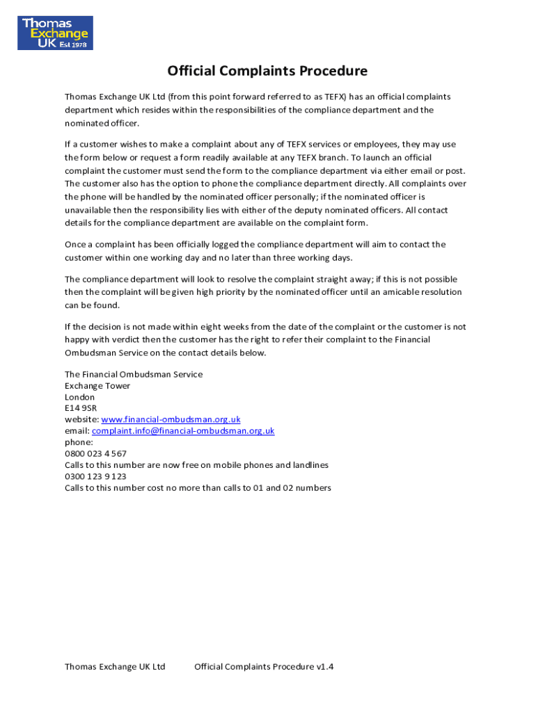 Official Complaints Procedure Thomas Exchange UK Ltd (from this point forward referred to as TEFX) has an official complaints department which resides within the responsibilities of the compliance