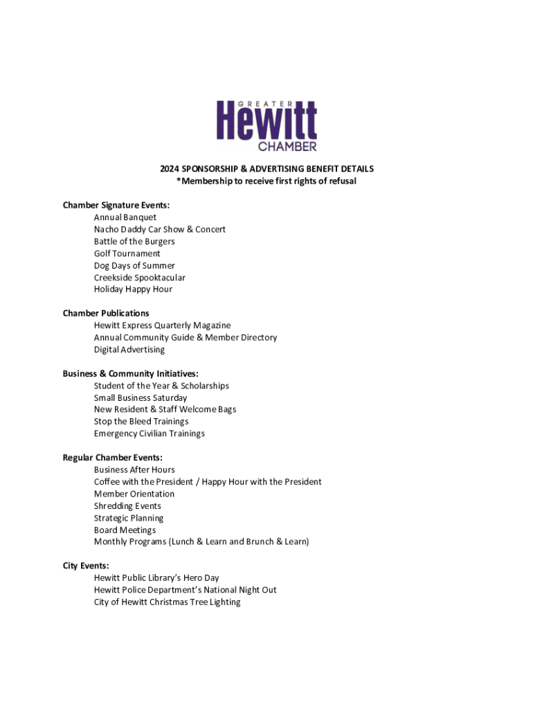2024 SPONSORSHIP & ADVERTISING BENEFIT DETAILS *Membership to receive first rights of refusal Chamber Signature Events: Annual Banquet Nacho Daddy Car Show & Concert Battle of the Burgers Golf Tournament