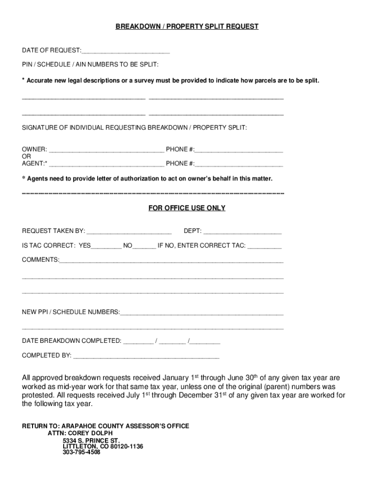 BREAKDOWN / PROPERTY SPLIT REQUESTDATE OF REQUEST:___