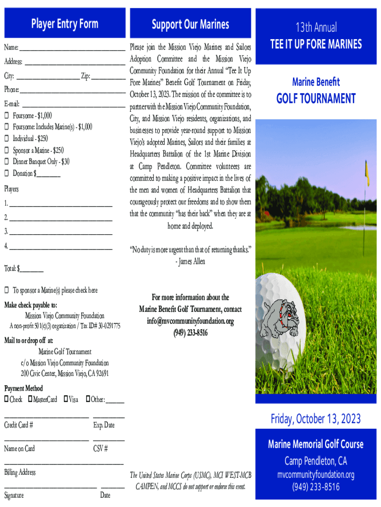 Player Entry FormSupport Our MarinesName: ___ Please join the Mission Viejo Marines and SailorsAddress: ___ Adoption City: ___ Zip: ___ Phone: ___ Email: ___ Foursome $1,000 Foursome: Includes Marine(s)