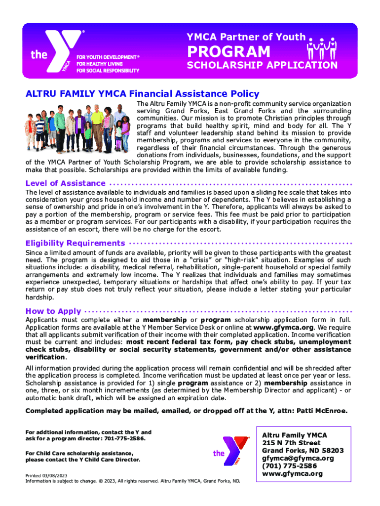 YMCA Partner of YouthPROGRAMSCHOLARSHIP APPLICATION ALTRU FAMILY YMCA Financial Assistance PolicyThe Altru Family YMCA is a nonprofit community service organization serving Grand Forks, East Grand
