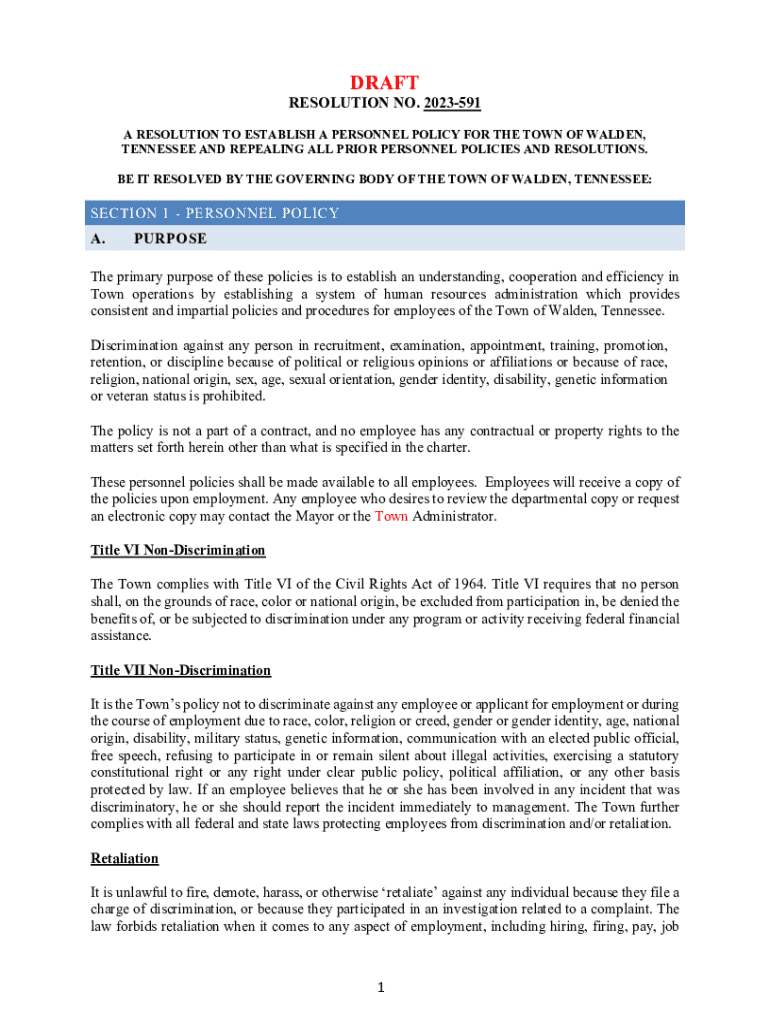 DRAFTRESOLUTION NO. 2023591 A RESOLUTION TO ESTABLISH A PERSONNEL POLICY FOR THE TOWN OF WALDEN, TENNESSEE AND REPEALING ALL PRIOR PERSONNEL POLICIES AND RESOLUTIONS. BE IT RESOLVED BY THE GOVERNING