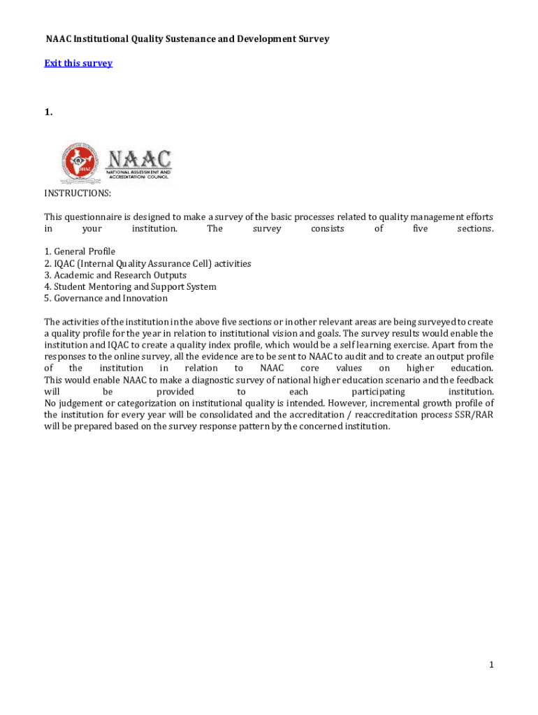 NAAC Institutional Quality Sustenance and Development Survey Exit this survey1.INSTRUCTIONS: This questionnaire is designed to make a survey of the basic processes related to quality management efforts