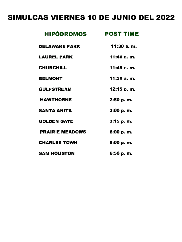 SIMULCAS VIERNES 10 DE JUNIO DEL 2022 HIPDROMOS DELAWARE PARKPOST TIME 11:30 a. m.LAUREL PARK11:40 a. m.CHURCHILL11:45 a. m.BELMONT11:50 a. m.GULFSTREAM12:15 p. m.HAWTHORNE2:50 p. m.SANTA ANITA3:00