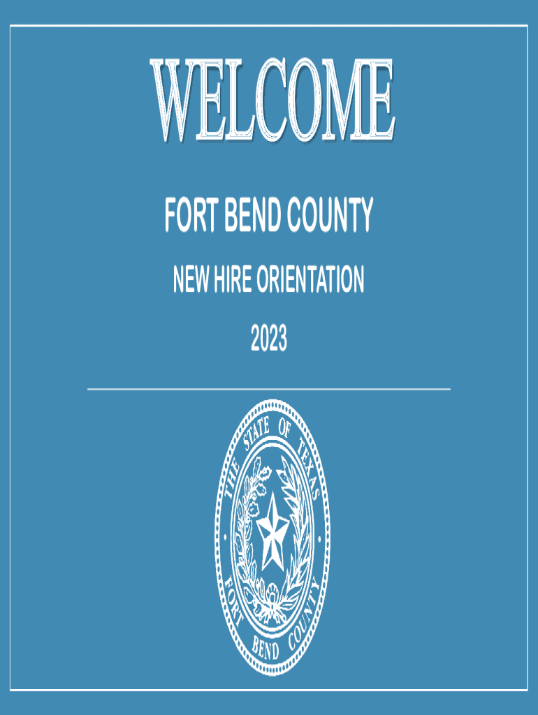 WELCOME FORT BEND COUNTY NEW HIRE ORIENTATION 2023Todays Agenda Picture taken for your badgeProvide your IDs to HR and complete Forms I9 and W4Review Fort Bend County Helpful InformationReview County