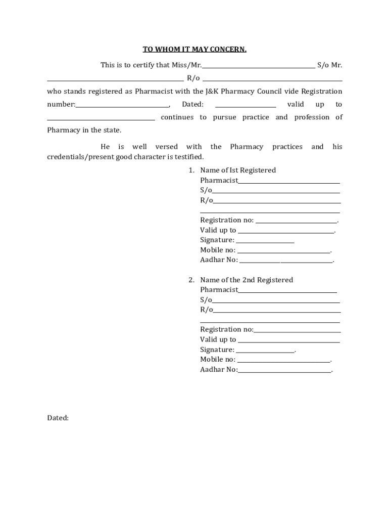 TO WHOM IT MAY CONCERN. This is to certify that Miss/Mr.___ S/o Mr. ___ R/o ___ who stands registered as Pharmacist with the J&K Pharmacy Council vide Registration number:___,Dated:___validupto___