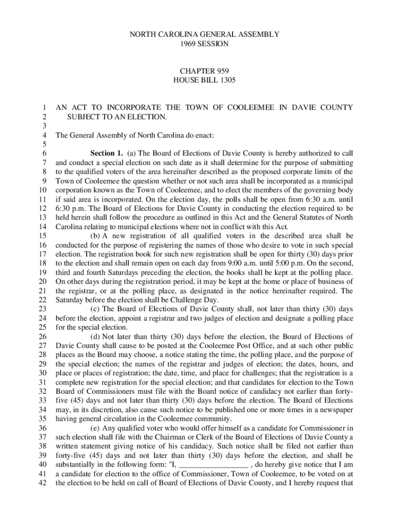 NORTH CAROLINA GENERAL ASSEMBLY 1969 SESSIONCHAPTER 959 HOUSE BILL 13051 2 3 4 5 6 7 8 9 10 11 12 13 14 15 16 17 18 19 20 21 22 23 24 25 26 27 28 29 30 31 32 33 34 35 36 37 38 39 40 41 42AN ACT TO