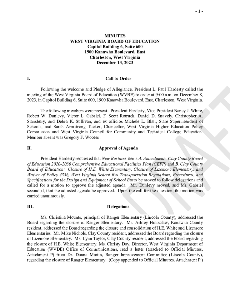 1MINUTES WEST VIRGINIA BOARD OF EDUCATION Capitol Building 6, Suite 600 1900 Kanawha Boulevard, East Charleston, West Virginia December 13, 2023 I.Call to OrderFollowing the welcome and Pledge of