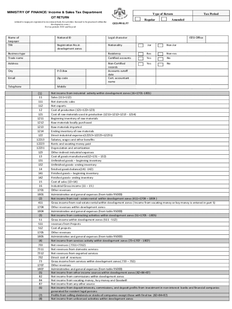 MINISTRY OF FINANCE/ Income & Sales Tax DepartmentType of ReturnCIT RETURN (related to taxpayers registered in investment body for activities licensed to be practiced within the development zones