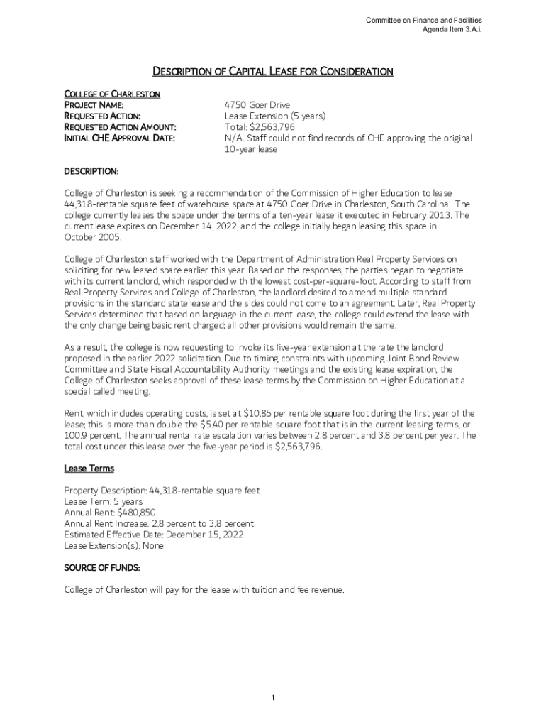 Committee on Finance and Facilities Agenda Item 3.A.i.DESCRIPTION OF CAPITAL LEASE FOR CONSIDERATION COLLEGE OF CHARLESTON PROJECT NAME: REQUESTED ACTION: REQUESTED ACTION AMOUNT: INITIAL CHE APPROVAL