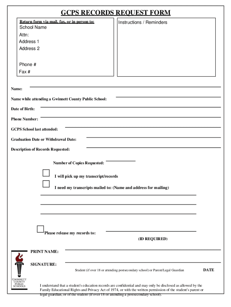 GPS RECORDS REQUEST FORM Return form via mail, fax, or in person to:Instructions / RemindersSchool Name Attn: Address 1 Address 2 Phone # Fax #Name: Name while attending a Gwinnett County Public School: