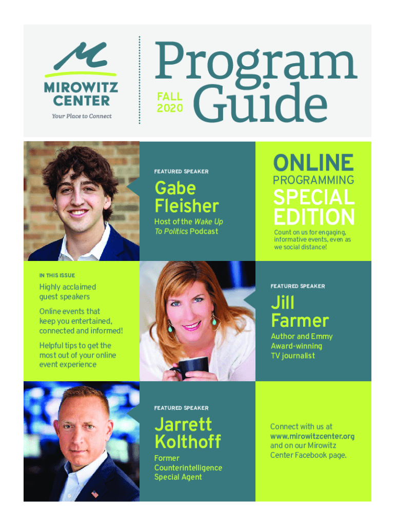 Program Guide FALL 2020FEATURED SPEAKERGabe FleisherHost of the Wake Up To Politics PodcastONLINE PROGRAMMINGSPECIALEDITION Count on us for engaging, informative events, even as we social distance!IN