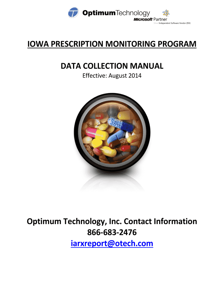 IOWA PRESCRIPTION MONITORING PROGRAM DATA COLLECTION MANUAL Effective: August 2014 Optimum Technology, Inc. Contact Information 866-683-2476 iarxreport otech.com TABLE OF CONTENTS REPORTING THE DATA