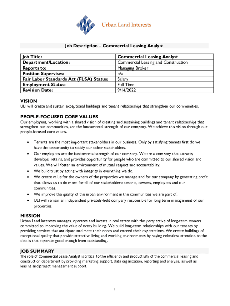 Job Description Commercial Leasing Analyst Job Title: Department/Location: Reports to: Position Supervises: Fair Labor Standards Act (FLSA) Status: Employment Status: Revision Date:Commercial Leasing