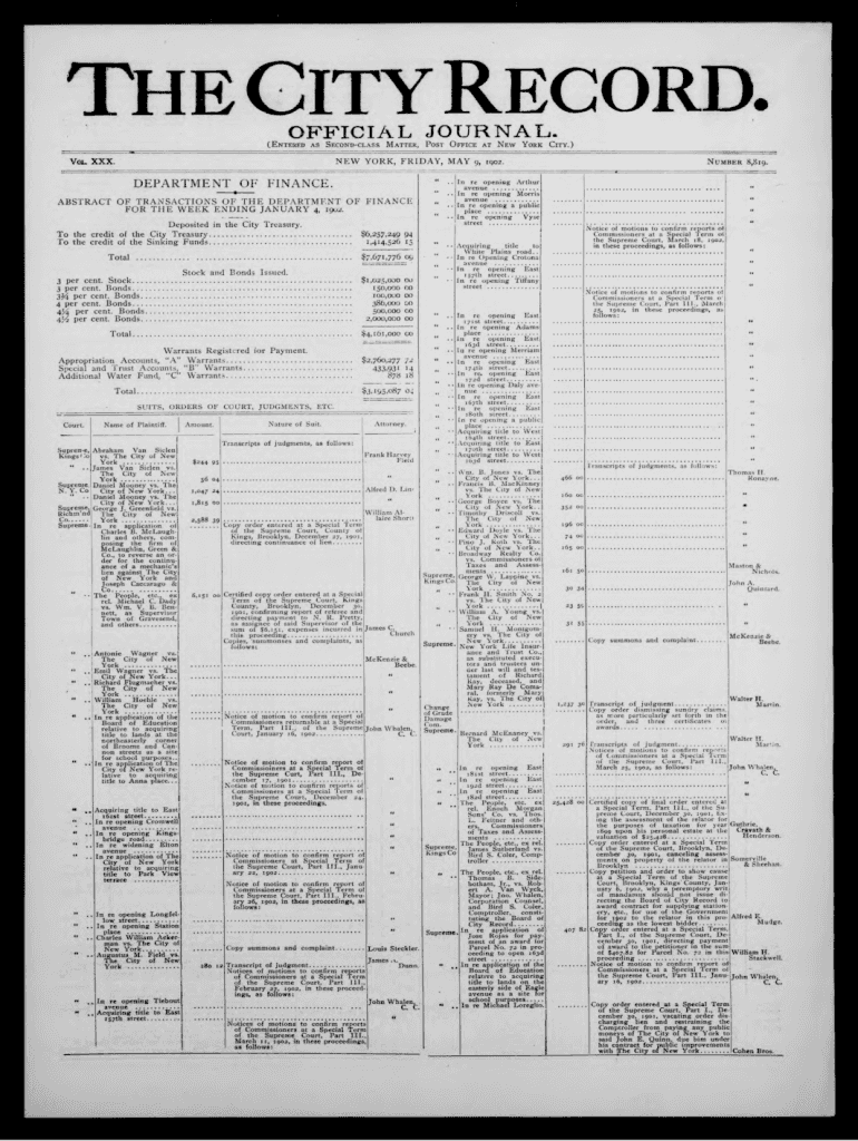 OFFICIAL JOT URAL.(ENTERED AS SECONDCLASS MATTER, POST 0 ?FINE AT NEW YORK CITY. )NEW YORK, FRI DAY, M KY 9, Igor.VOL. XXX.DEPARTMENT OF FINANCE. Nontseie 8,819.ABSTRACT OF TRANSACTIONS