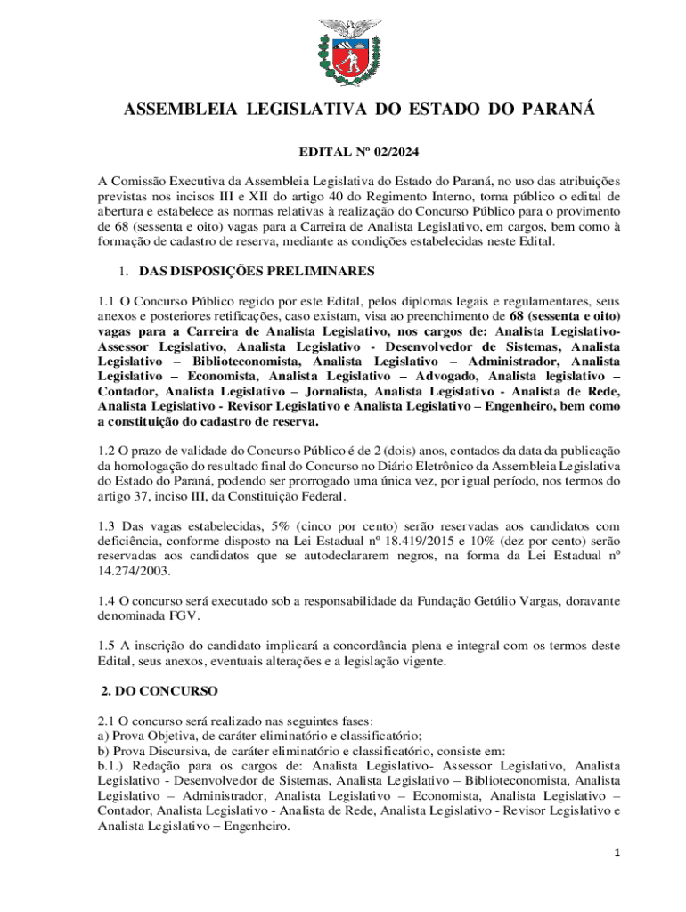 ASSEMBLEIA LEGISLATIVA DO ESTADO DO PARAN EDITAL N 02/2024 A Comisso Executiva da Assembleia Legislativa do Estado do Paran, no uso das atribuies previstas nos incisos III e XII do artigo 40 do Regimento