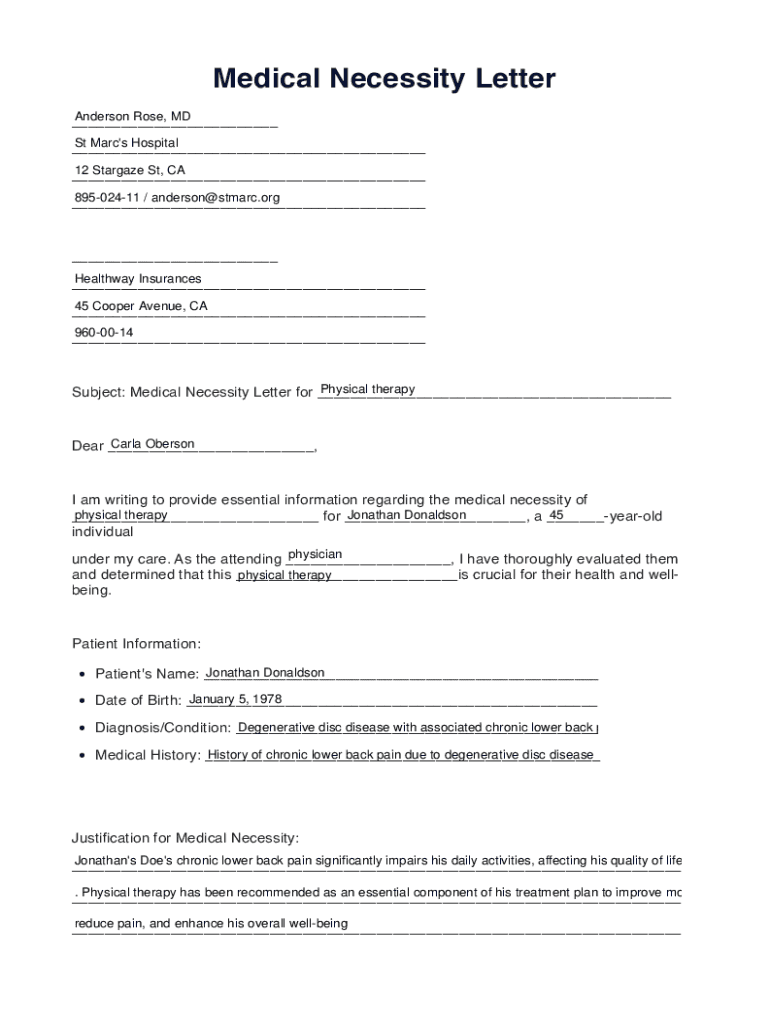 Medical Necessity Letter Anderson Rose, MD ___ St Marc\'s Hospital ___12 Stargaze St, CA ___ 89502411 / anderson@stmarc.org ___ ___ Health way Insurances ___ 45 Cooper Avenue, CA ___ 9600014 ___ Physical
