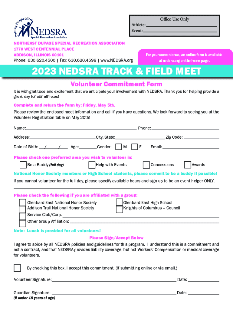 2023Saturday, May 20thVolunteer Packet We are looking for someone like You! Interested in helping out? Scan the QR Code or fill out the attached form!1770 West Centennial Place Addison, IL 60101nedsra.org