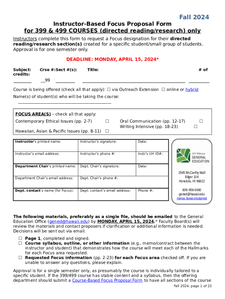 The Directed Reading/Research Registration TCES 498/ ... - manoa hawaii is a writable document that should be submitted to the relevant address to provide specific information. It has to be filled-out and signed, which can be done in hard copy, or with a particular solution e. g. PDFfiller. It helps to fill out any PDF or Word document directly in your browser, customize it according to your needs and put a legally-binding e-signature. Right after completion, you can easily send the Directed Reading/Research Registration TCES 498/ ... - manoa hawaii to the appropriate individual, or multiple ones via email or fax. The blank is printable too thanks to PDFfiller feature and options proposed for printing out adjustment. In both electronic and in hard copy, your form should have a organized and professional look. You can also turn it into a template to use it later, so you don't need to create a new document again. You need just to customize the ready template.
