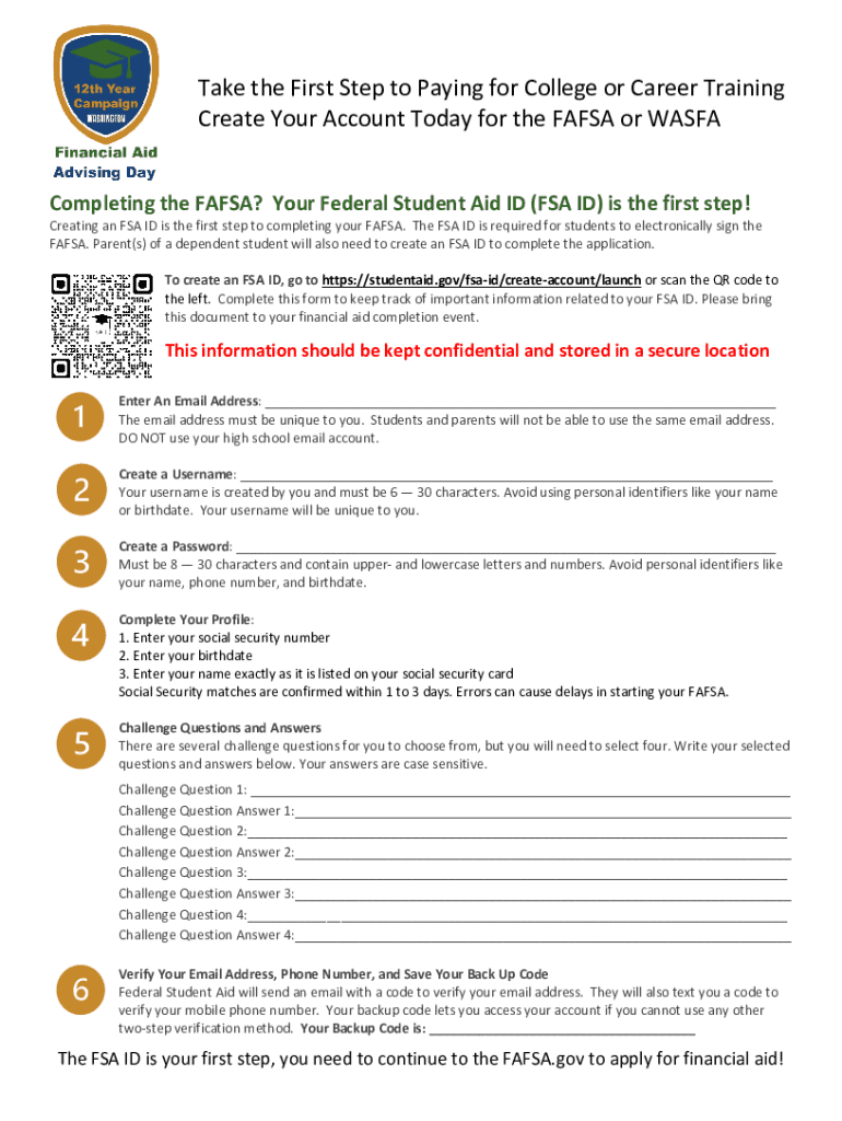 Take the First Step to Paying for College or Career Training Create Your Account Today for the FAFSA or WASFA Completing the FAFSA? Your Federal Student Aid ID (FSA ID) is the first step!Creating