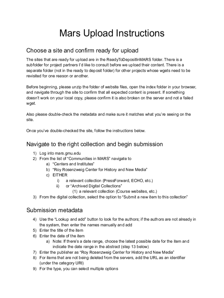 Mars Upload Instructions Choose a site and confirm ready for upload The sites that are ready for upload are in the ReadyToDepositInMARS folder. There is a subfolder for project partners Id like to