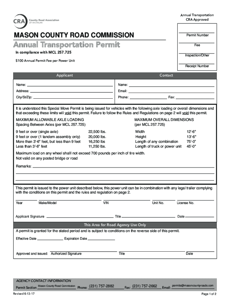 Annual Transportation CRA ApprovedPermit NumberAnnual Transportation PermitFeeIn compliance with MCL 257.725Inspection/Other$100 Annual Permit Fee per Power UnitReceipt NumberApplicantContactName:Name:Address:Email:City/St/Zip:Phone:Fax:It