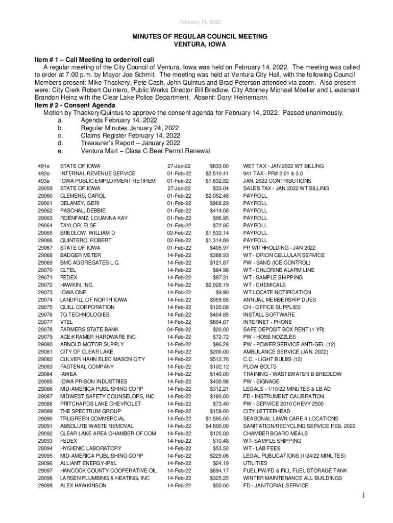 A regular meeting of the City Council of Ventura, Iowa was held on February 14, 2022. The