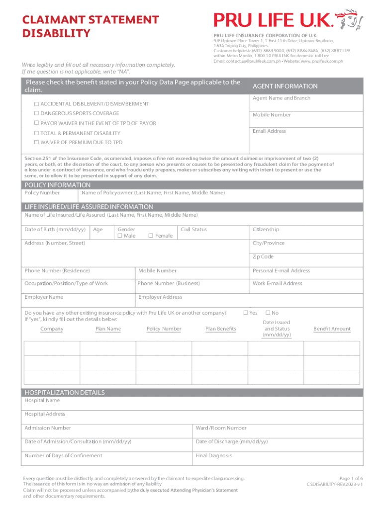 CLAIMANT STATEMENT DISABILITYPRU LIFE INSURANCE CORPORATION OF U.K.9/F Uptown Place Tower 1, 1 East 11th Drive, Uptown Bonifacio, 1634 Taguig City, Philippines Customer helpdesk: (632) 8683 9000,