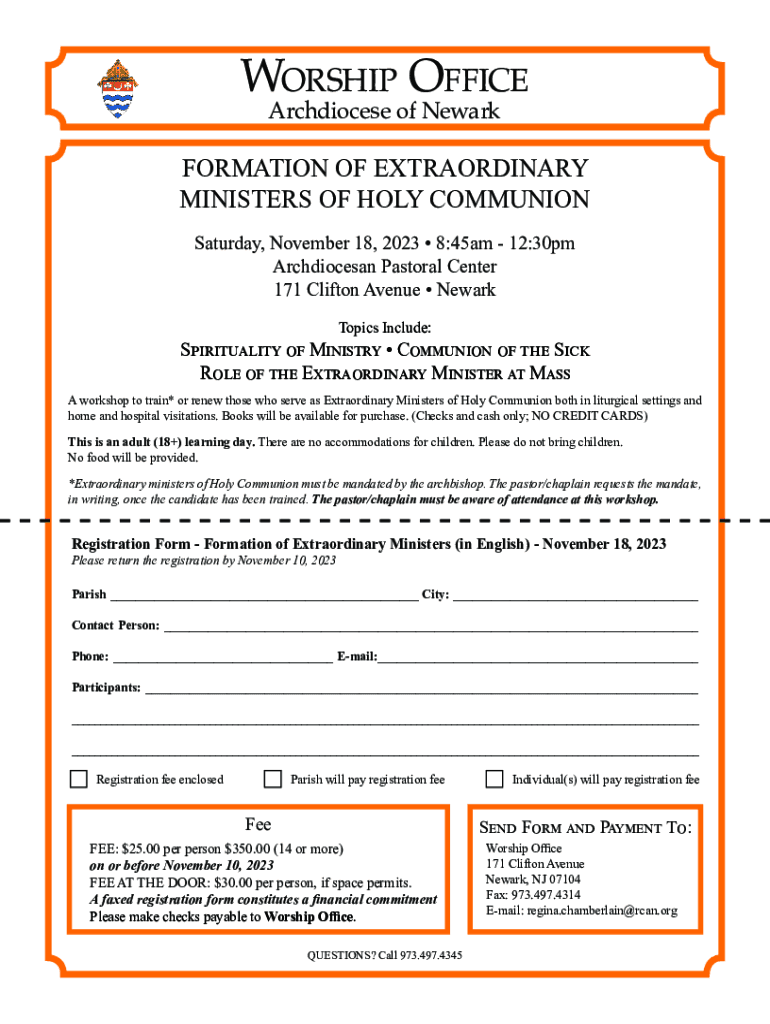 Worship Office Archdiocese of NewarkFORMATION OF EXTRAORDINARY MINISTERS OF HOLY COMMUNION Saturday, November 18, 2023 8:45am 12:30pm Archdiocesan Pastoral Center 171 Clifton Avenue Newark Topics